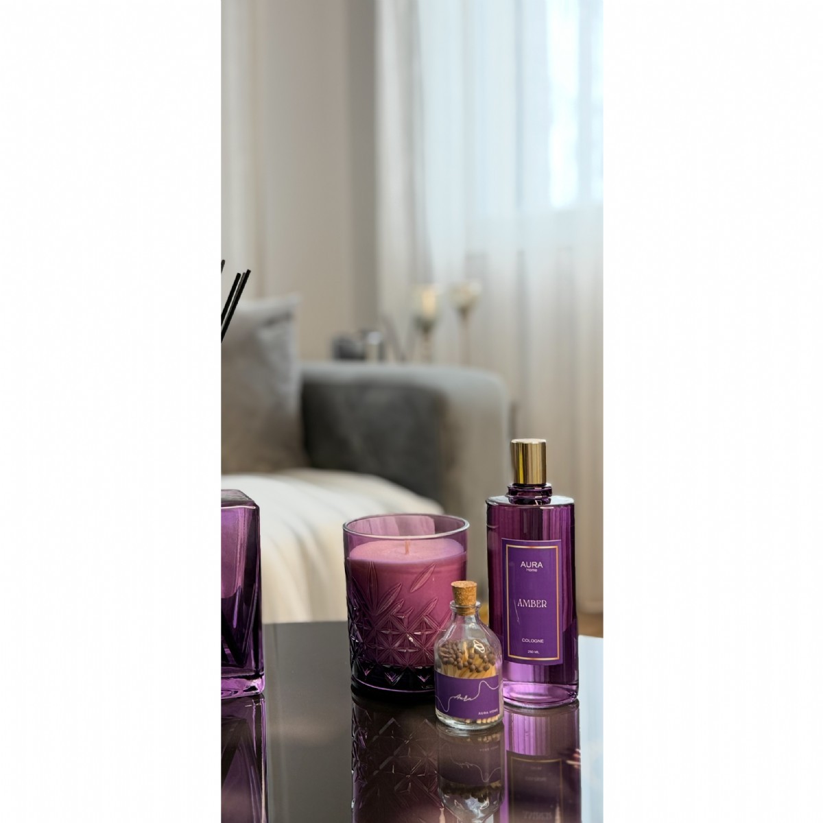 Ürünler 4 parçadır: 1 L bambu çubuklu oda kokusu, 250 ml amber kokulu cam kolonya, siyah pleksi kapaklı kristal cam mum 420 cc (Paşabahçe Timeless) ve dekoratif cam şişe kibrit